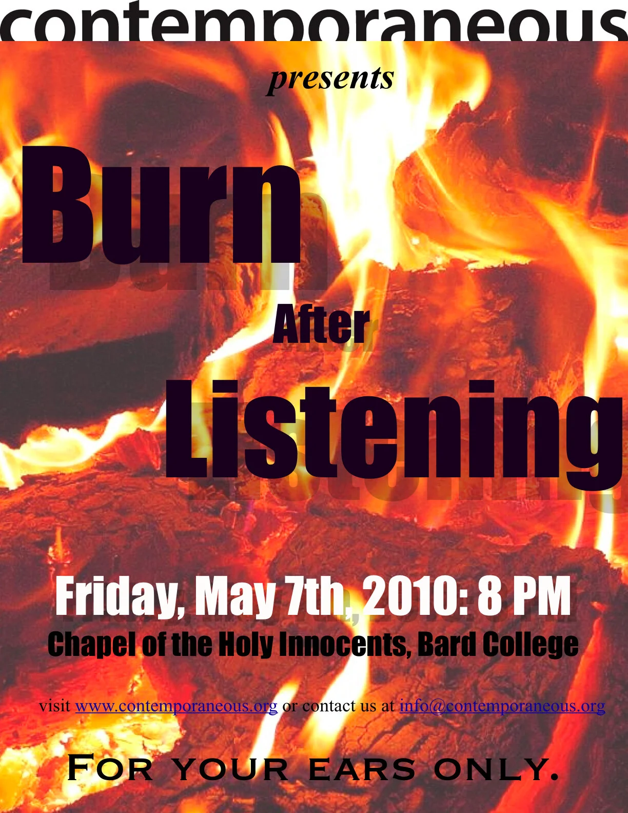 Like a highly confidential message to be burned after reading, we return to the campus of Bard College to present a unique concert experience for your ears only. This novel combination of works by four emerging and two established composers is a unique combination of secretive and aggressive works never to be heard together again.